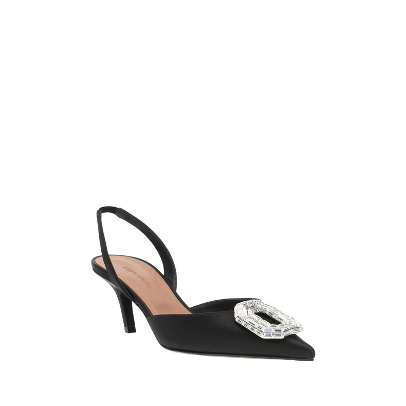 Amina Muaddi’s silk satin Camelia Pumps are a slingback style that feature an elongated toe embellished with a jewel-embossed rhinestone and diamante appliqué. The leather stiletto heel adds elegance, while the logo-embossed leather insole completes the design with a distinctive and refined touch.