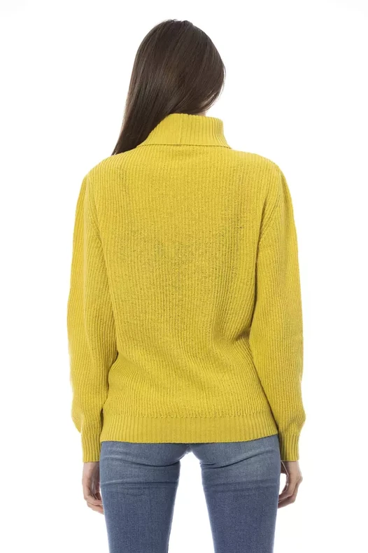 Elevate your wardrobe with a touch of sophistication from Baldinini Trend. This luxurious turtleneck sweater is a perfect blend of comfort and chic. Crafted from a sumptuous mix of wool, viscose, cashmere, and a hint of nylon, it’s designed to keep you cozy without compromising on style. Featuring long sleeves and a ribbed collar, cuffs, and bottom for a refined finish, the highlight is the subtle Baldinini Trend monogram in metal, adding an exclusive touch to your ensemble. In a vibrant yellow hue, it’s a statement piece that’s sure to turn heads.