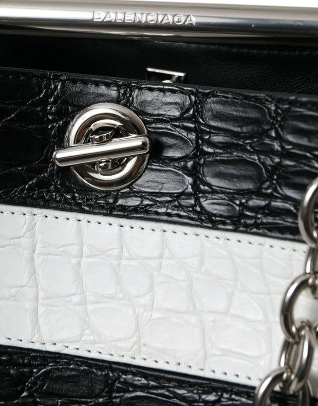 Indulge in the epitome of luxury with the Balenciaga crocodile leather maxi bucket bag. This 100% Authentic, stunning accessory is fresh from the fashion house with original tags, ready to elevate your style. Perfect for those who appreciate the fine craftsmanship, it features a sleek black and white palette matched with the prestige of crocodile leather, further enhanced by lamb and calf leather details.