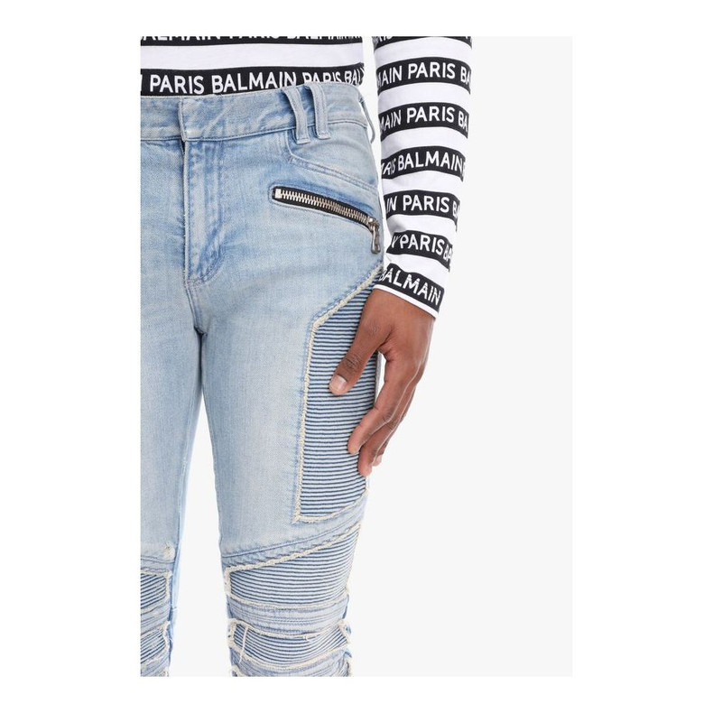 Balmain slim fit jeans in light blue washed denim, decoration with patches and raw cut details, five pockets plus two front zip pockets