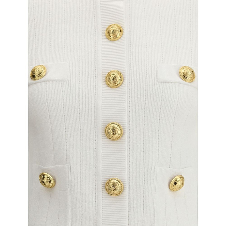Balmain’s Cardigan is a sleek and sophisticated piece featuring a figure-flattering cropped short-sleeved design. The ribbed crew neck adds a touch of sophistication, while the embossed button closure and two buttoned welt pockets on the front offer functionality and style. The fitted fit enhances the silhouette, while the monochrome pattern lends a clean, versatile look that is ideal for elegant, everyday pairings.