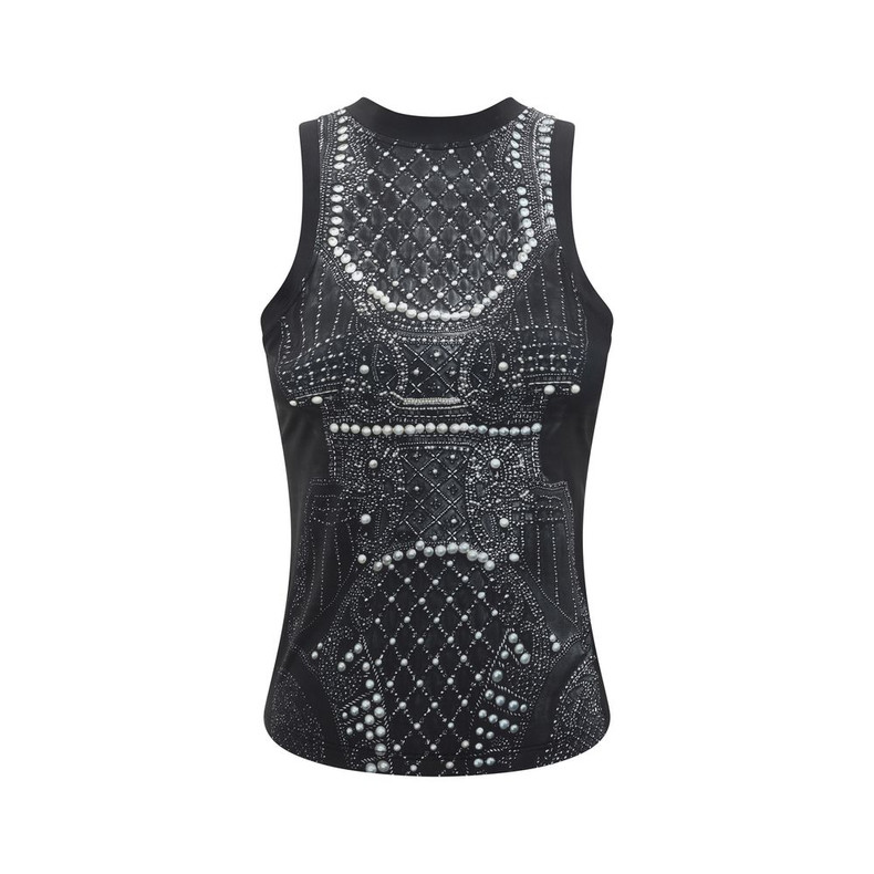 Balmain’s sleeveless round-neck Top features a contrasting printed trompe-l’œil pattern on both the front and back, creating a striking and modern visual effect. The Balmain Couture fabric label on the back adds a detail of high tailoring and authenticity, giving the garment an exclusive touch. It is an elegant and sophisticated choice, ideal for those seeking a refined look with an accent of originality.