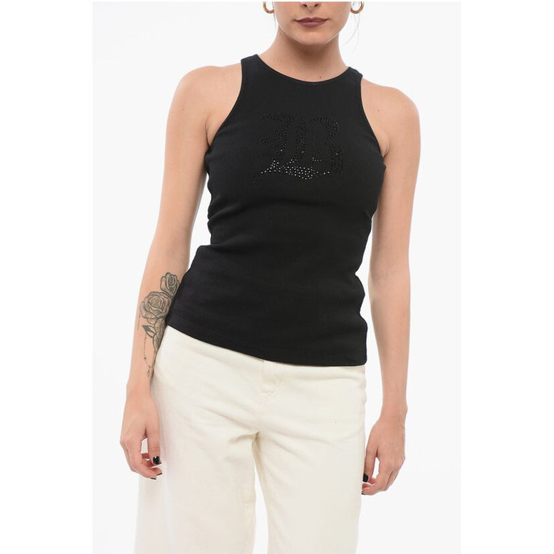 Blumarine Ribbed Tank Top with Rhinestoned Logo