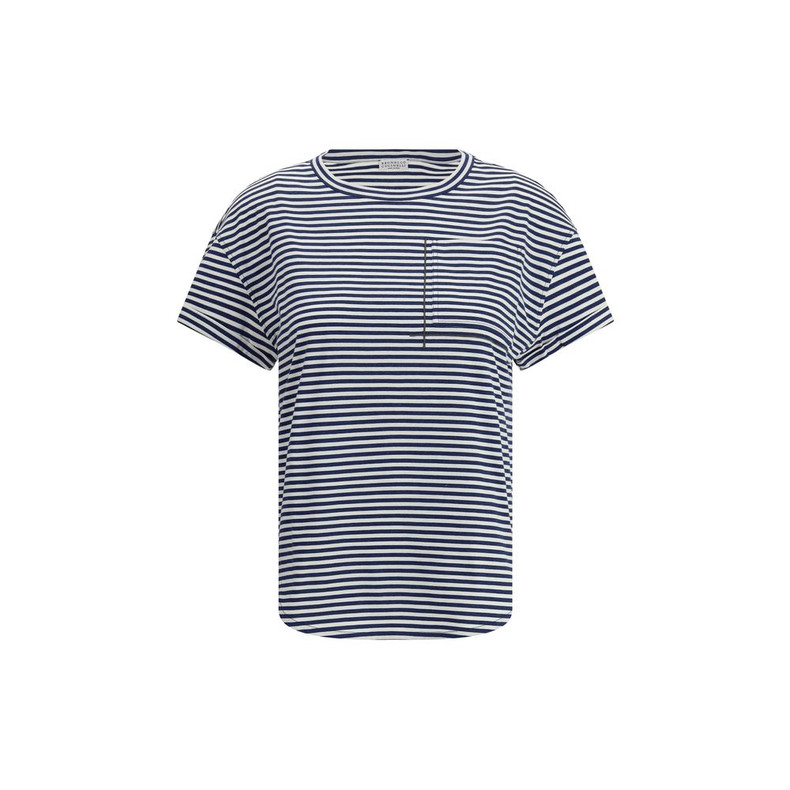Brunello Cucinelli’s cotton T-Shirt features a two-tone striped pattern, giving the garment a dynamic and modern touch. An appliquéd welt pocket on the front is embellished with iconic shiny jewel details, adding a note of light and sophistication. A rounded hemline completes the design, offering additional elegance to the pattern.