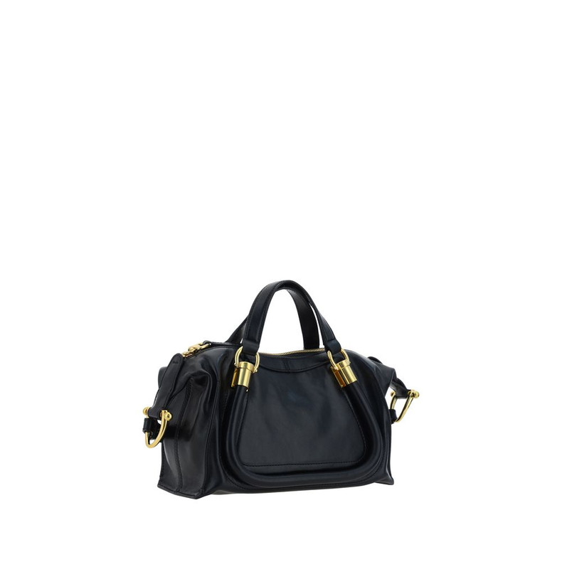 Leather Paraty Shoulder Bag by Chloé featuring two flat top handles, an adjustable and removable shoulder strap, the brand’s iconic press-stamped monogram on the front, a single compartment, a top zipper closure, and a monochrome pattern.