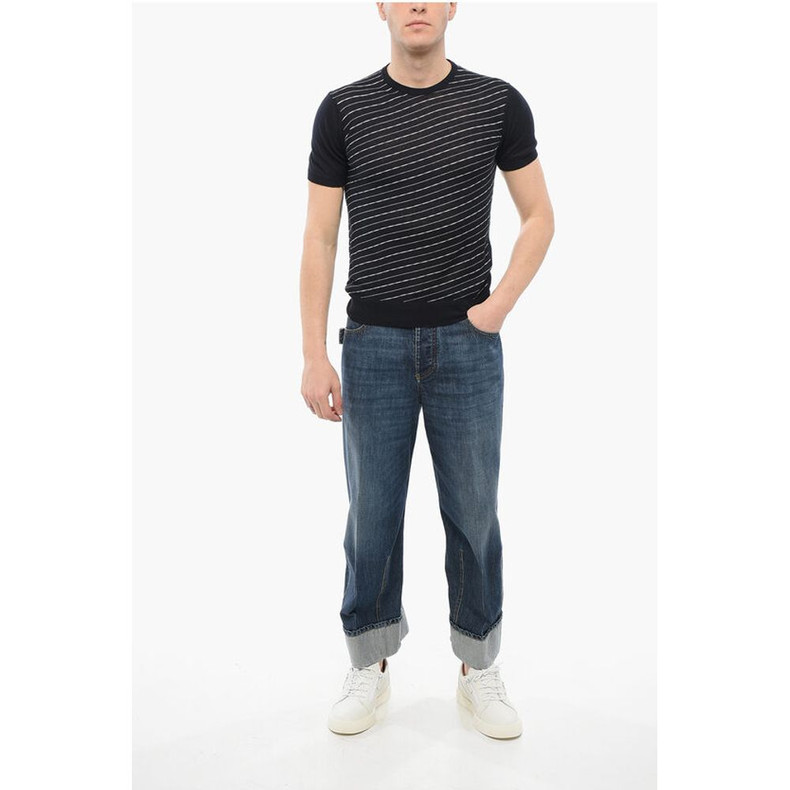 Corneliani Short Sleeved Striped Silk and Linen Crewneck Sweater