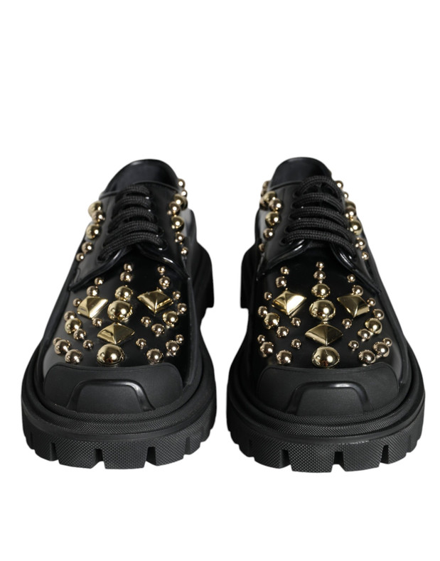 Gorgeous, brand new with tags 100% Authentic Dolce & Gabbana black Trekking derby. The model is made of soft polished leather, and the lapel-style inserts on the side panels are made of dense rubber. The masculine character of the pair on a chunky tread sole is balanced by the decorations, a pattern of shiny gold studs on the cape.