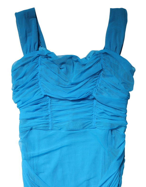 Dolce & Gabbana Blue Mesh Trim Ruched Tulle Sheath Dress