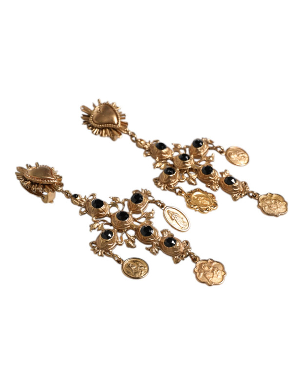 Dolce & Gabbana Gold Black Crystal Cross Sacred Heart Dangling Earrings