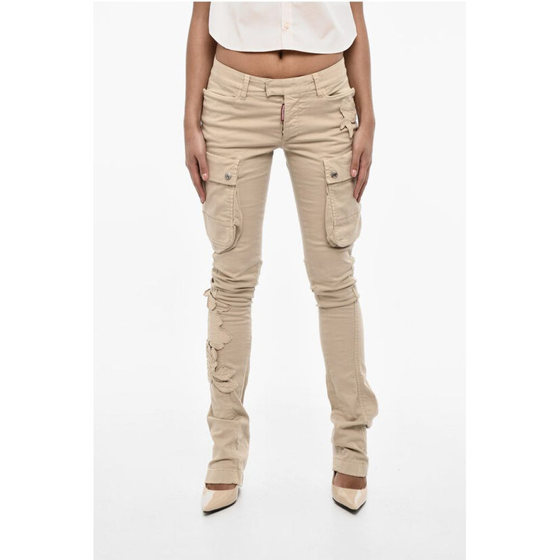Dsquared² Regular Waist Cotton Twill Cargo Pants with Floral Applicati