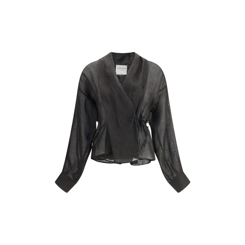 Forte_Forte’s Crossed shirt is a sleek, modern piece featuring shawl lapels that add a sophisticated touch. The dropped shoulders create a relaxed, flowing silhouette, while the knotted ribbon front closure lends a delicate, feminine accent. The semi-transparent design gives a light and airy effect, making it ideal for a refined and versatile look.