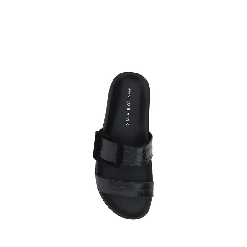 Calfskin Mayfu Sandals by Manolo Blahnik, featuring a double strap at the back, a flat sole, a croc-effect leather design, a round toe, a rectangular embossed applique buckle at the front, and a contrasting logo-embossed insole.