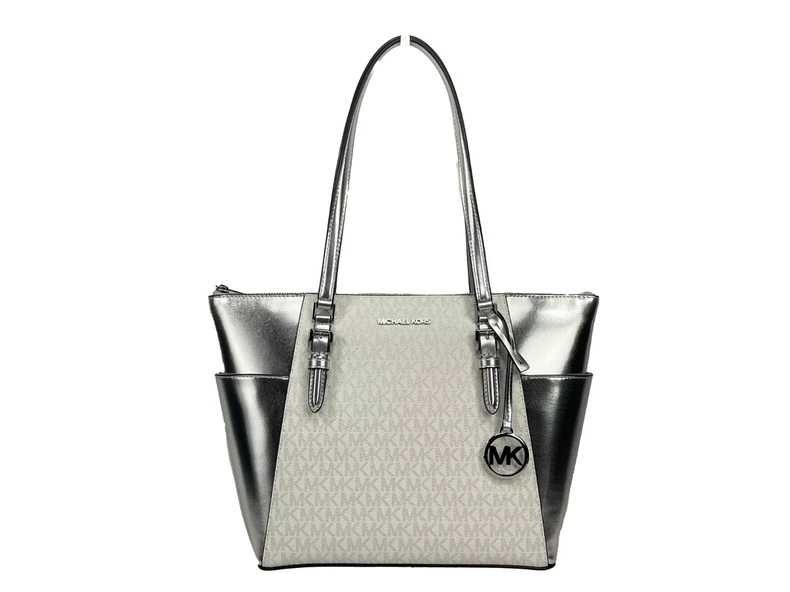 Michael Kors Charlotte Large Leather Top Zip Tote Bag Purse Silver
