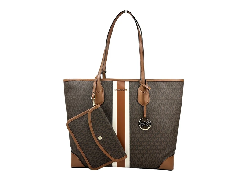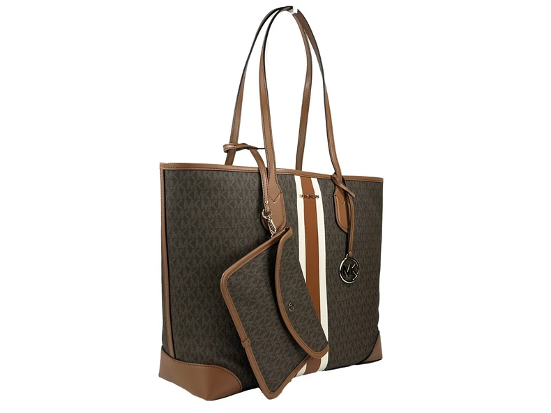 Michael Kors Eva Large Stripe Travel Tote Bag Plus Pouch Brown