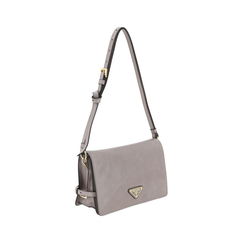 Leather Shoulder Bag by Prada, an adjustable flat shoulder strap, front closure by magnetic flap, dual interior compartments, front closure by magnetic flap, a welt pocket on the back with zipper, iconic three-dimensional, enameled brand plaque applied to the front.