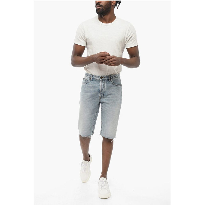 Saint Laurent Light Wash Denim Shorts with Fringed Bottom