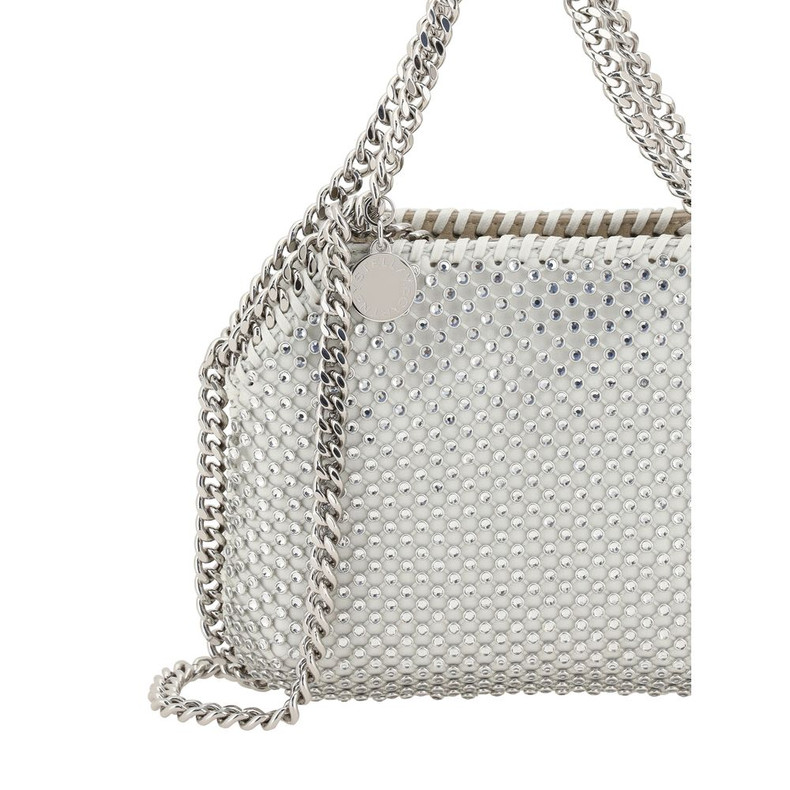 Eco Crystal & Mesh Shoulder Bag From Stella McCartney, the brand’s iconic faux leather design, chain trim on the bag’s profiles, chain top handles, interior snap button closure, single interior compartment, metal pendant attached to the base of the handle with iconic engraved logo, shiny all-over appliqué jewelry.