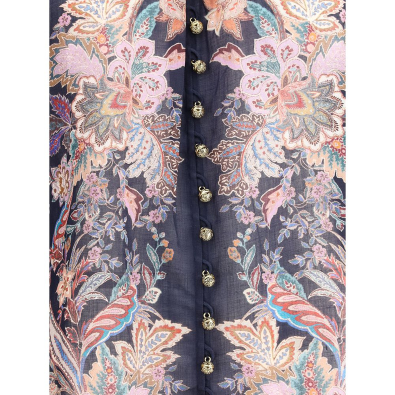 The Rhiannon Billow Blouse by Zimmermann features a raised collar with scallop-edge detail and a front button closure. Long sleeves, with fitted cuffs, and a straight hem complete the design. The navy-blue bottom is embellished with a refined multicolored paisley pattern, adding a touch of elegance and originality to the garment.